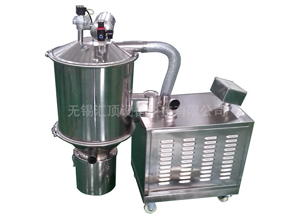 真空上料机由真空泵(无油、无水)或者罗茨风机、不锈钢吸料嘴、输送软管、PE过滤器(或316L不锈钢过滤器)、压缩空气反吹装置、气动放料门装置、真空料斗和料位自动控制装置等组成,整套系统设计合理、制造精良。