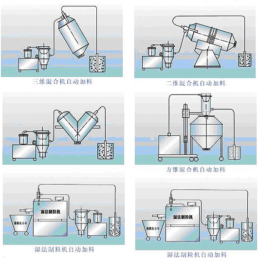 该机是粉状料、粒状料、粉粒料混合料的真空输送设备。真空上料机能自动地将各种物料输送到包装机、注塑机、粉碎机等设备的料斗中,也能直接把混合的物料输送到混合机(如V型混合机、二维混合机、三维混合机等)中,减轻了工人劳动强度,解决了加料时粉尘外溢等问题,是制药厂、食品厂通过认证、促进清洁、文明生产的设备。