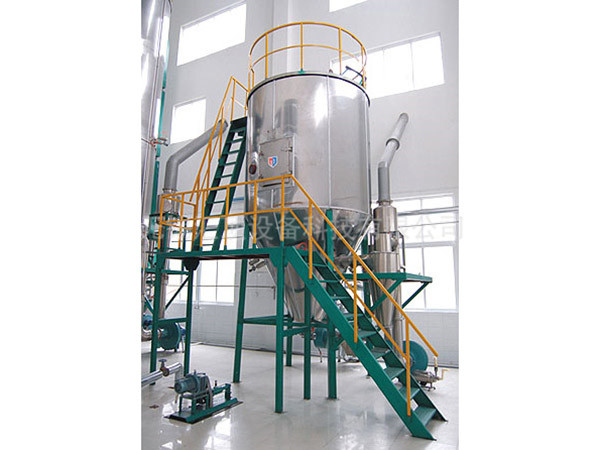 空气通过过滤器和加热器,进入干燥器顶部的空气分配器,热空气呈螺旋状均匀进入干燥器。料液由料液槽经过滤器由泵送至干燥器的离心雾化器,使料液喷成绩效的雾状液滴,料液和热空气并流接触水分迅速蒸发,在短时间内干燥为粉末状成品。成品由于干燥塔地步和旋风分离器排除,废弃由风机排出。
